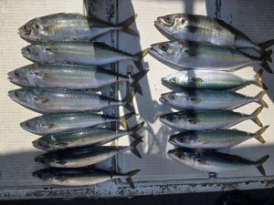 マアジ48㌢頭に5匹 マサバ50㌢頭に14匹